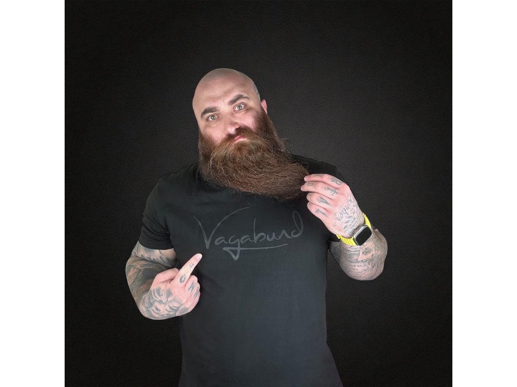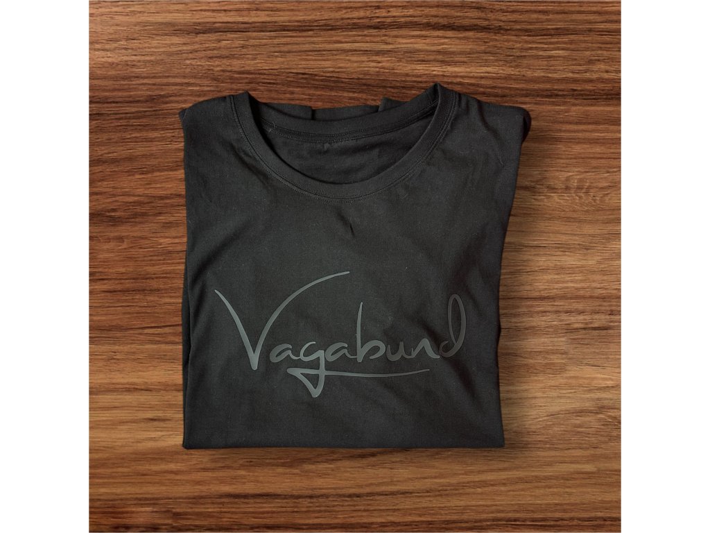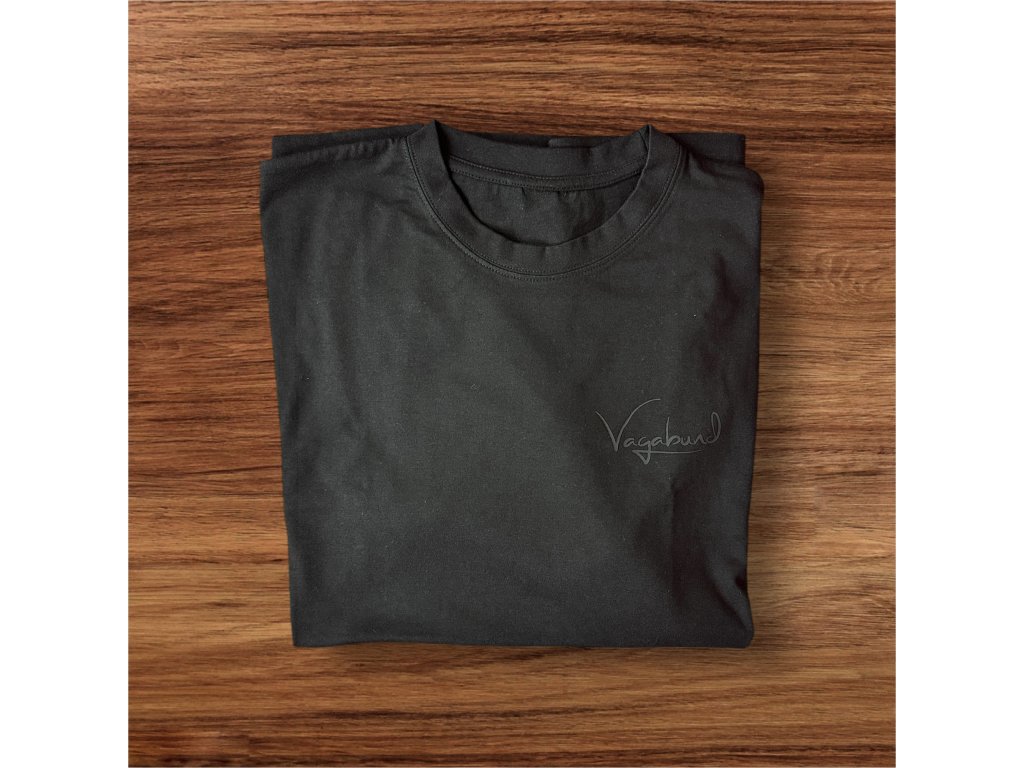 Představujeme ti naše prémiová trička VAGABUND v černo-černém provedení s elegantním gumovým 3D potiskem, který dává tričku luxusní, čistý a přitom drsně minimalistický vibe.